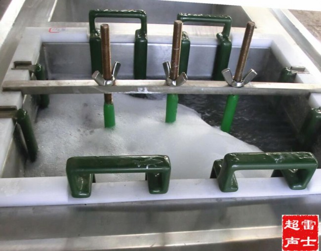 1.將超聲清洗機(jī)清洗槽內(nèi)加入適量清洗液,注意液位必須高于側(cè)面超聲波振板高度。
