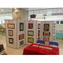 展板的展示方式:1.可以用掛鉤或者掛線來展示作品,展板橫梁的頂部為”帶凹槽的扁鋁“,可掛各種金屬掛鉤,如上圖的畫面就是用S勾掛上去的。2.展板上粘貼物品方法:需用“透明膠或大力膠”打底之后再使用海綿膠粘貼廣告畫等。