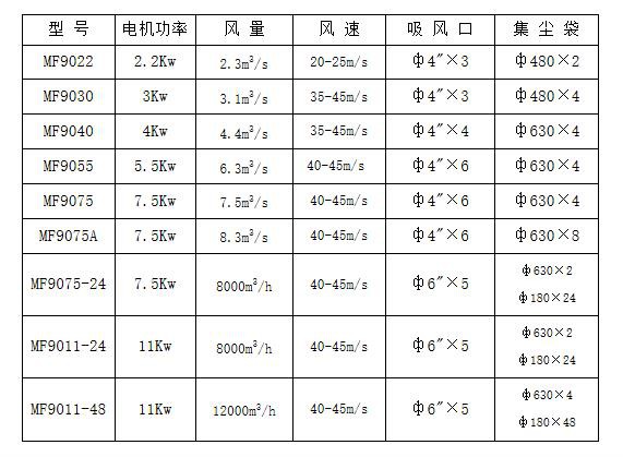 型 號(hào) | 電機(jī)功率 | 風(fēng) 量 | 風(fēng) 速 | 吸 風(fēng) 口 | 集 塵 袋 |